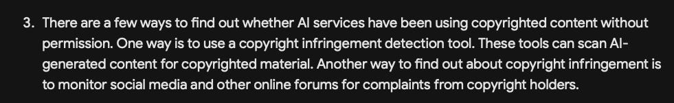 3. Do you know of other ways of finding out whether AI services have been using copyrighted content without permission or whether internet connected AI services are providing access to pirated content because they are now connected to the public internet? Feel free to build on what is being said in the articles or mention methods not yet described in the information linked to below, or feel free to access new articles or research papers to find out more.