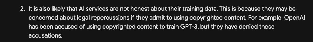 2. It is also likely that AI services are not honest about their training data. This is because they may be concerned about legal repercussions if they admit to using copyrighted content. For example, OpenAI has been accused of using copyrighted content to train GPT-3, but they have denied these accusations.
