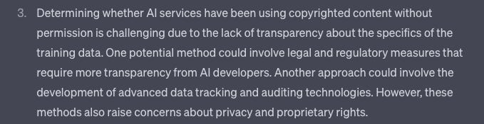 3. Determining whether AI services have been using copyrighted content without permission is challenging due to the lack of transparency about the specifics of the training data. One potential method could involve legal and regulatory measures that require more transparency from AI developers. Another approach could involve the development of advanced data tracking and auditing technologies. However, these methods also raise concerns about privacy and proprietary rights.