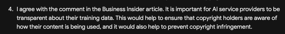 4. I agree with the comment in the Business Insider article. It is important for AI service providers to be transparent about their training data. This would help to ensure that copyright holders are aware of how their content is being used, and it would also help to prevent copyright infringement.