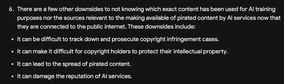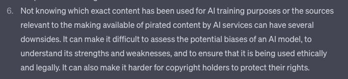6. There are a few other downsides to not knowing which exact content has been used for AI training purposes nor the sources relevant to the making available of pirated content by AI services now that they are connected to the public internet. These downsides include:
