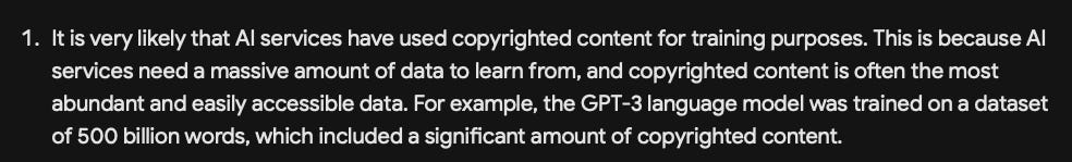 Google Bard: It is very likely that AI services have used copyrighted content for training purposes. It is also likely that AI services are not honest about their training data