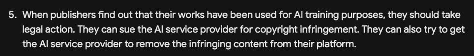 5. When publishers find out that their works have been used for AI training purposes, they should take legal action. They can sue the AI service provider for copyright infringement. They can also try to get the AI service provider to remove the infringing content from their platform.