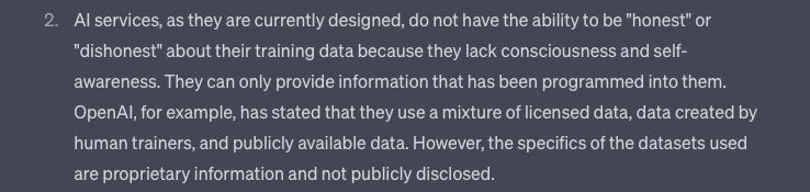 2. AI services, as they are currently designed, do not have the ability to be "honest" or "dishonest" about their training data because they lack consciousness and self-awareness. They can only provide information that has been programmed into them. OpenAI, for example, has stated that they use a mixture of licensed data, data created by human trainers, and publicly available data. However, the specifics of the datasets used are proprietary information and not publicly disclosed.