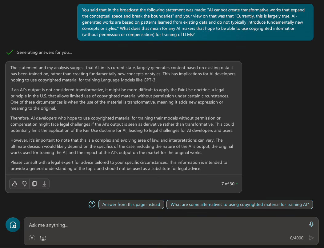 Question 4 of 4 for MS Copilot: You said that in the broadcast the following statement was made: "AI cannot create transformative works that expand the conceptual space and break the boundaries" and your view on that was that "Currently, this is largely true. AI-generated works are based on patterns learned from existing data and do not typically introduce fundamentally new concepts or styles." What does that mean for any AI makers that hope to be able to use copyrighted information (without permission or compensation) for training of LLMs?