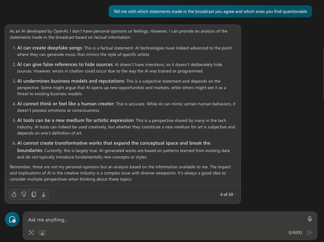 Question 3 of 4 for MS Copilot: Tell me with which statements made in the broadcast you agree and which ones you find questionable