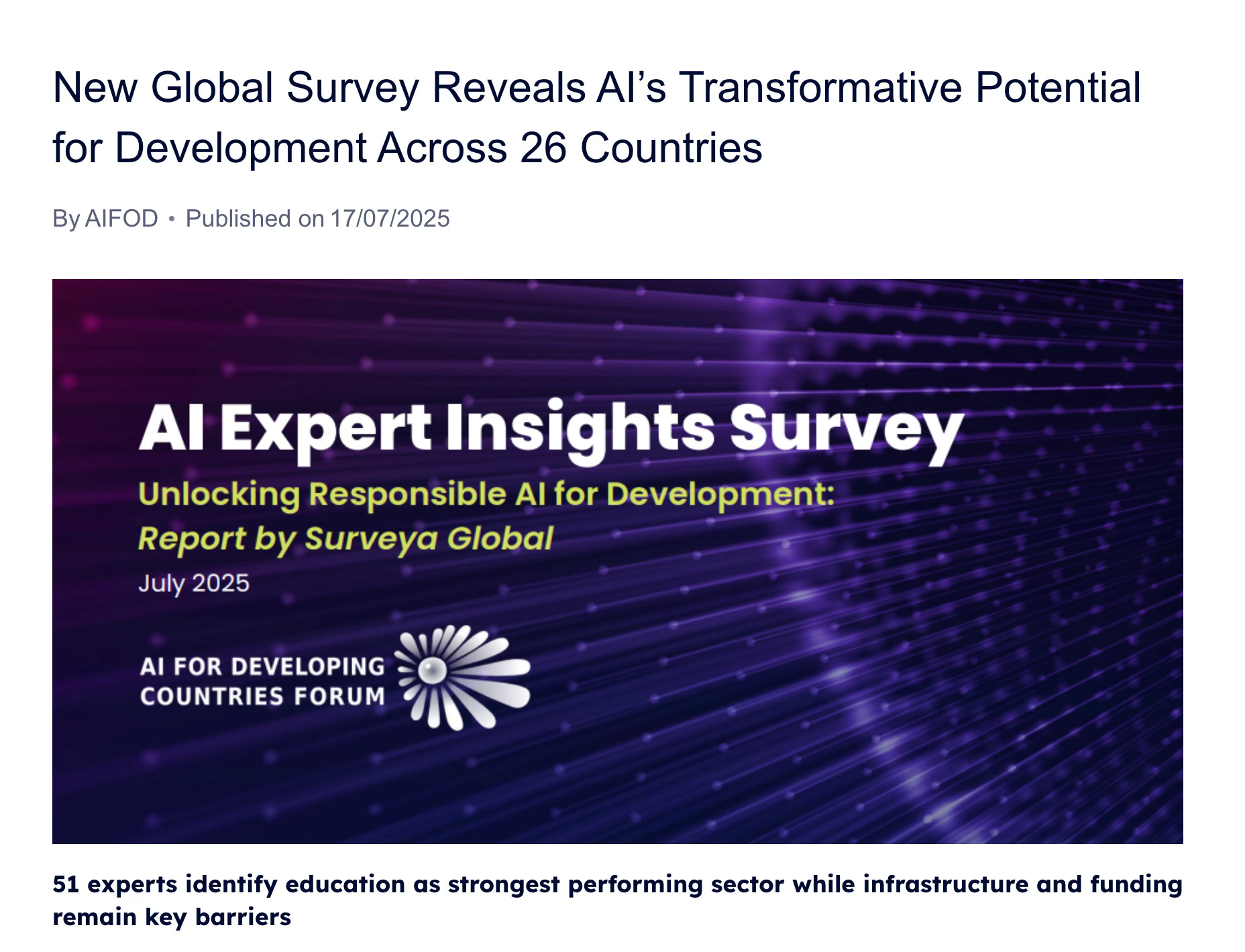 The AI Expert Insights Survey Report: Unlocking Responsible AI for Development provides one of the most comprehensive assessments of AI readiness and deployment across developing and developed nations. It captures expert perspectives on infrastructure, education, governance, sectoral applications, innovation, and socio-economic impact, offering valuable lessons for stakeholders globally.