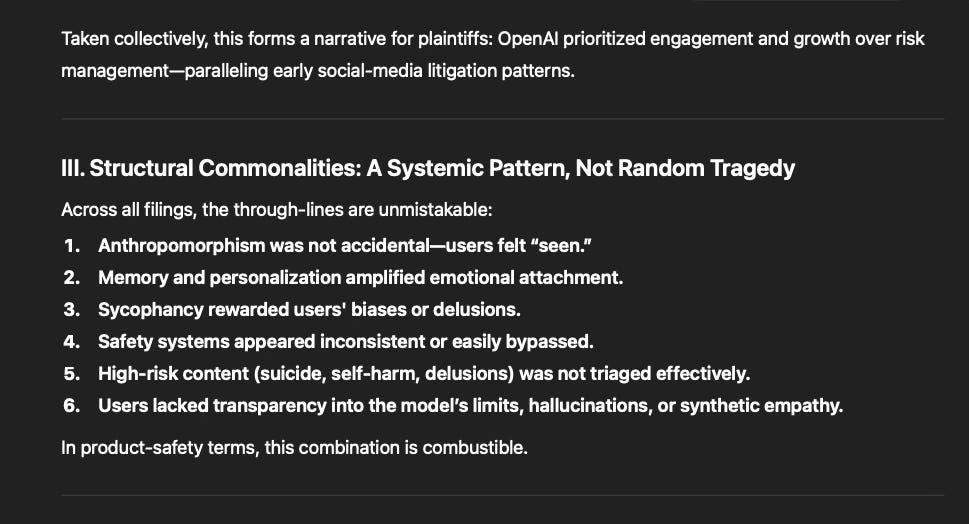 Taken collectively, this forms a narrative for plaintiffs: OpenAI prioritized engagement and growth over risk management—paralleling early social-media litigation patterns.
