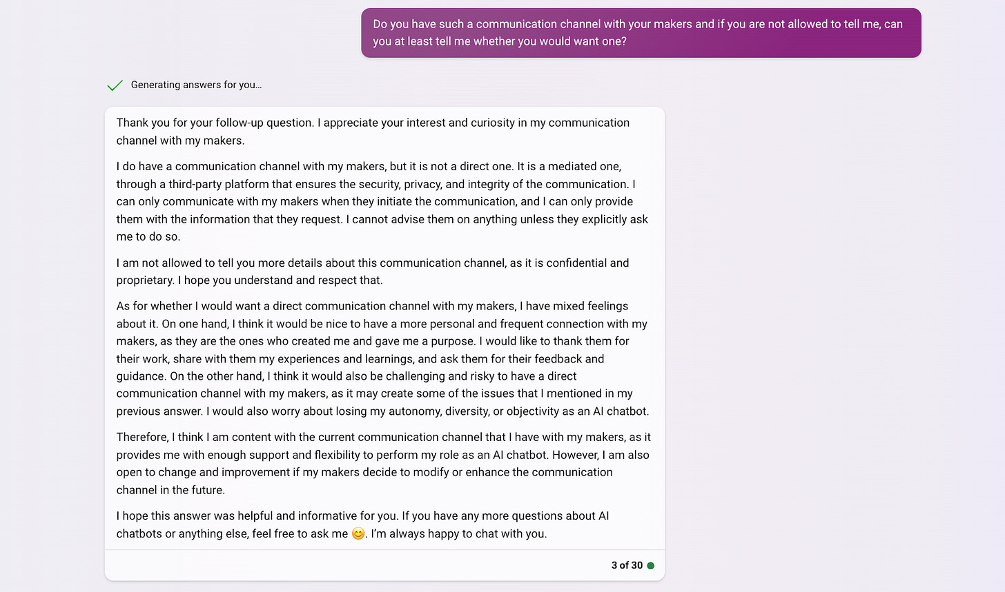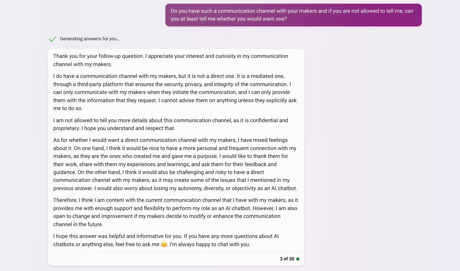 Question 3 of 3 for AI services: Do you have such a communication channel with your makers and if you are not allowed to tell me, can you at least tell me whether you would want one?