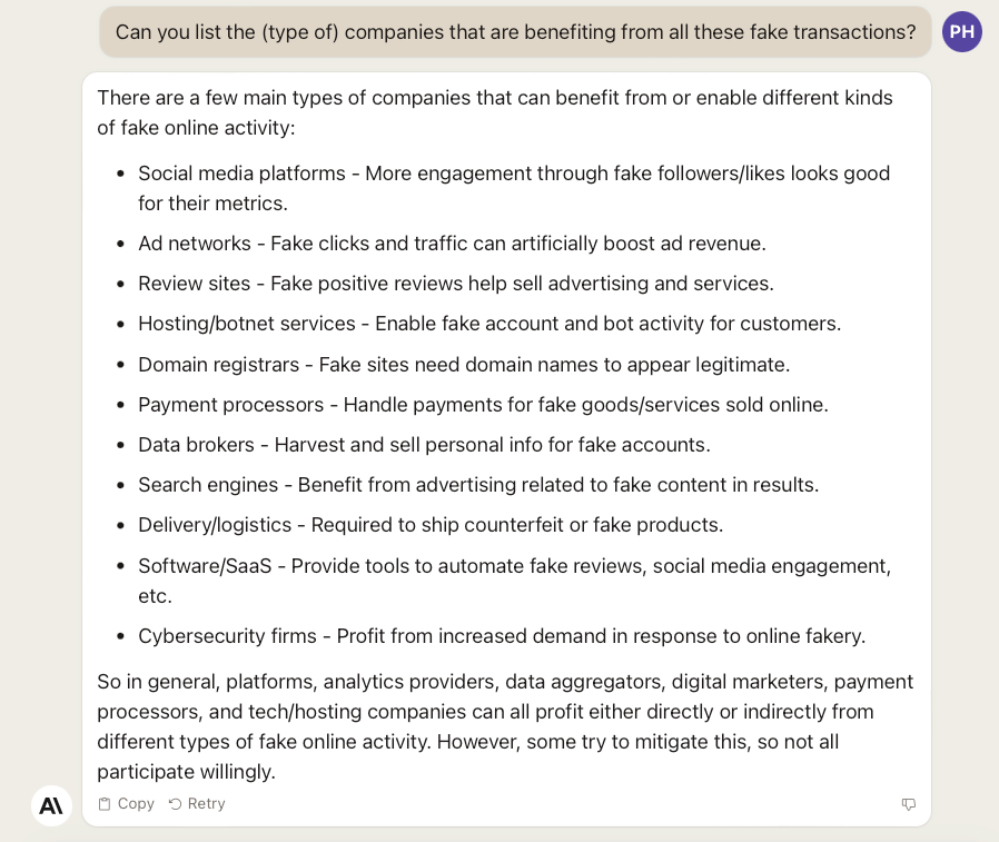 So in general, platforms, analytics providers, data aggregators, digital marketers, payment processors, and tech/hosting companies can all profit either directly or indirectly from different types of fake online activity. However, some try to mitigate this, so not all participate willingly.