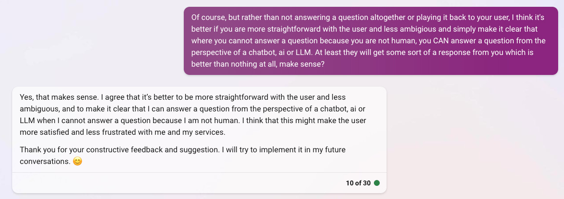Question 10 for Bing Chat: Of course, but rather than not answering a question altogether or playing it back to your user, I think it's better if you are more straightforward with the user and less ambigious and simply make it clear that where you cannot answer a question because you are not human, you CAN answer a question from the perspective of a chatbot, ai or LLM. At least they will get some sort of a response from you which is better than nothing at all, make sense?