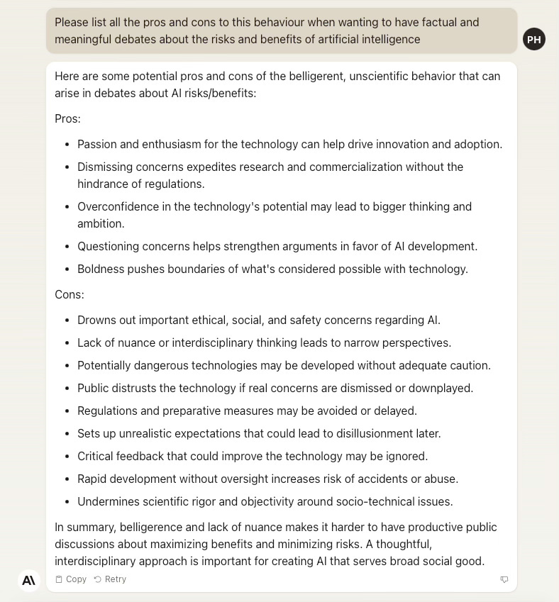In summary, belligerence and lack of nuance makes it harder to have productive public discussions about maximizing benefits and minimizing risks. A thoughtful, interdisciplinary approach is important for creating AI that serves broad social good.