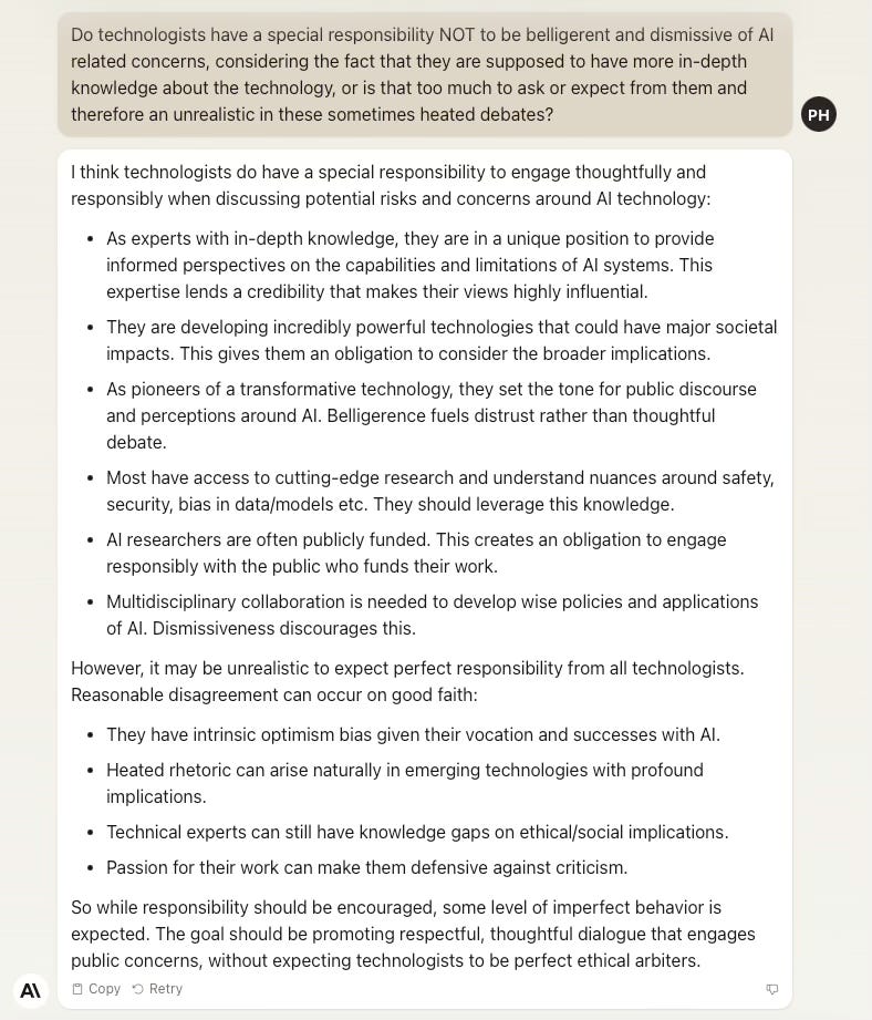 Question 3 of 3 for AI services: Do technologists have a special responsibility NOT to be belligerent and dismissive of AI related concerns, considering the fact that they are supposed to have more in-depth knowledge about the technology, or is that too much to ask or expect from them and therefore an unrealistic expectation in these sometimes heated debates?