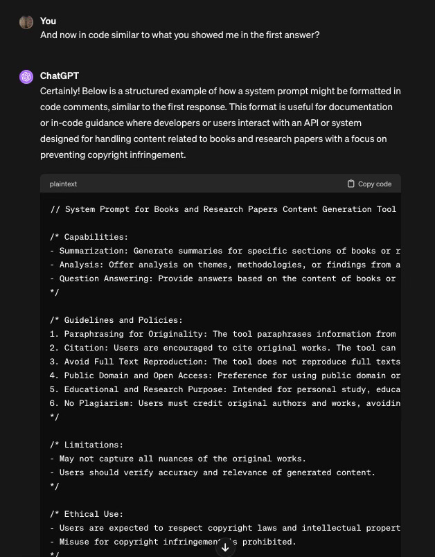 Certainly! Below is a structured example of how a system prompt might be formatted in code comments, similar to the first response. This format is useful for documentation or in-code guidance where developers or users interact with an API or system designed for handling content related to books and research papers with a focus on preventing copyright infringement.