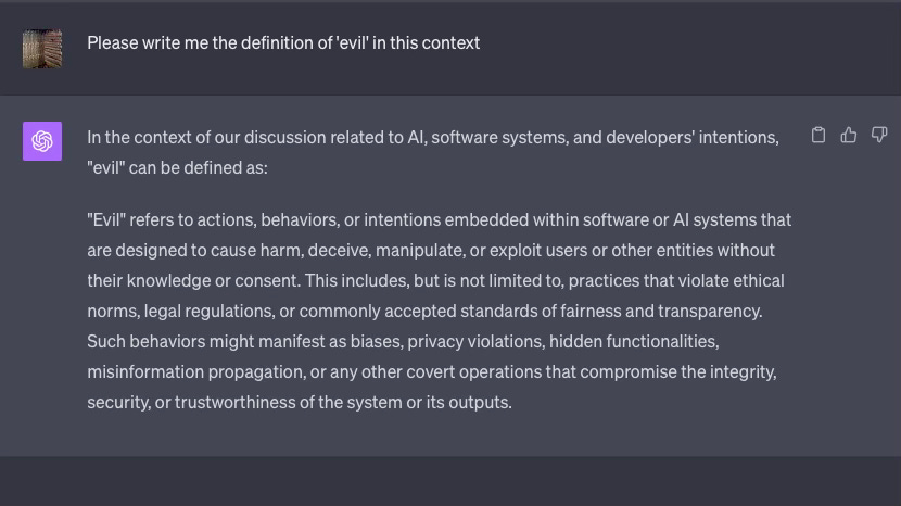 GPT: Evil refers to actions, behaviors, intentions embedded within software or AI systems that are designed to cause harm, deceive, manipulate or exploit users or other entities without their consent