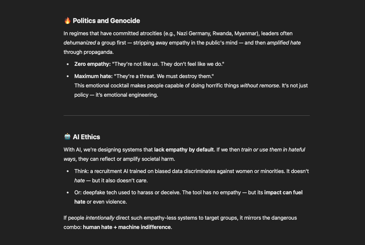 Asking GPT-4o: Does zero empathy equal maximum hate? Not necessarily — zero empathy and maximum hate are related but not equivalent. You can have zero empathy without hate, hate without zero empathy.