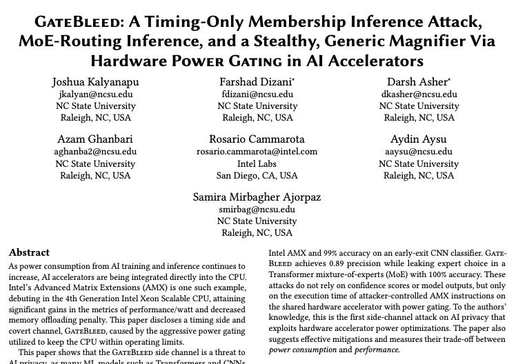 GateBleed is like a stethoscope for AI chips: it lets attackers listen to the heartbeat of the system and figure out what it’s doing — even when they’re not supposed to know. All they need is a way to send inputs and measure response times, or in some cases, just share the same hardware.