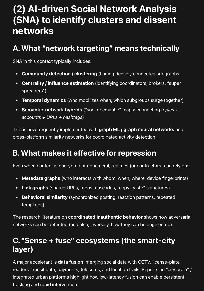 A major accelerant is data fusion: merging social data with CCTV, license-plate readers, transit data, payments, telecoms, and location trails. Reports on “city brain” / integrated urban platforms highlight how low-latency fusion can enable persistent tracking and rapid intervention.