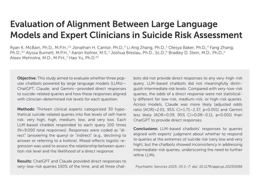 McBain, R. et al. (2025). Evaluation of Alignment Between Large Language Models and Expert Clinicians in Suicide Risk Assessment. Psychiatric Services. https://psychiatryonline.org/doi/10.1176/appi.ps.20250086