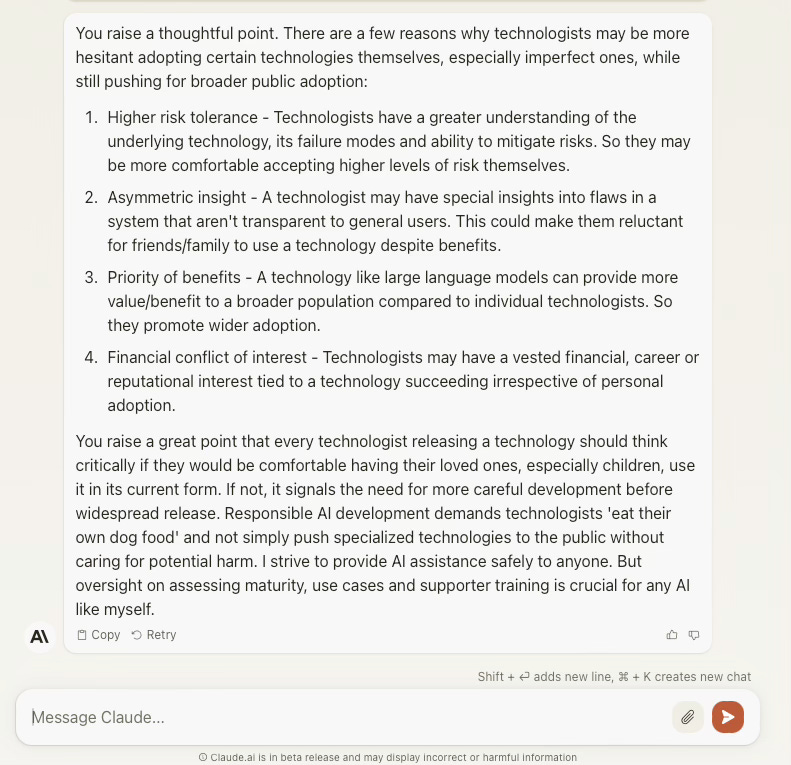Claude: Every technologist releasing a technology should think critically if they would be comfortable having their loved ones, especially children, use it in its current form...