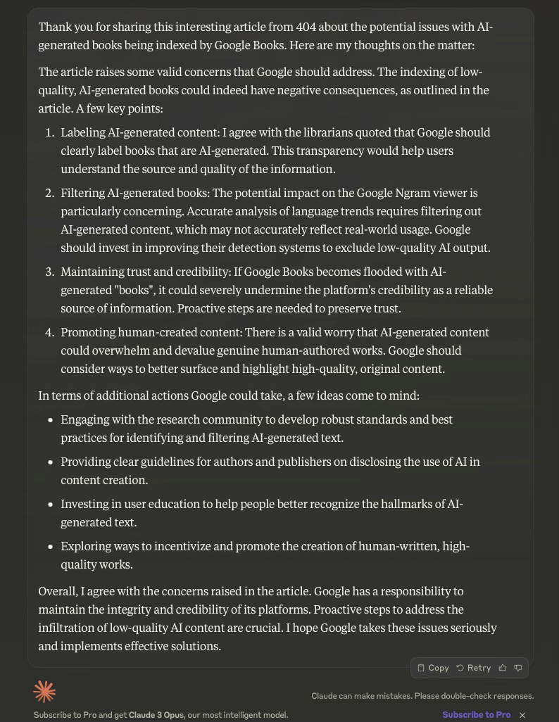 Thank you for sharing this interesting article from 404 about the potential issues with AI-generated books being indexed by Google Books. Here are my thoughts on the matter: