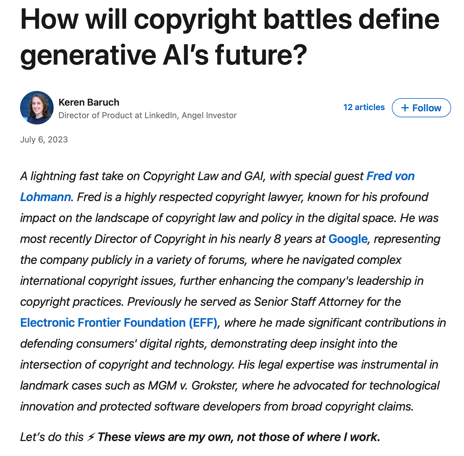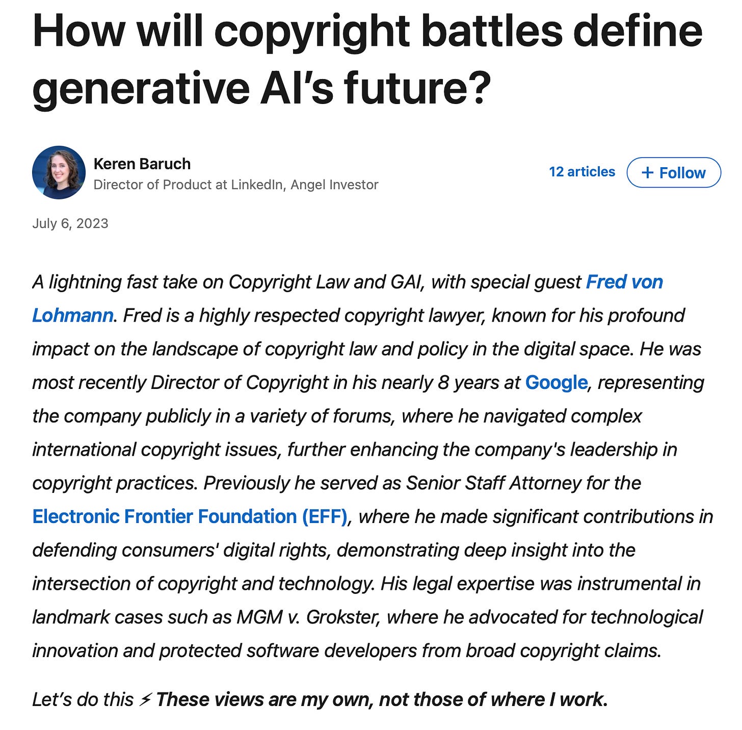 Full LinkedIn post: https://www.linkedin.com/pulse/how-copyright-battles-define-generative-ais-future-keren-baruch