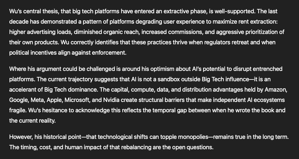 ...whether through data harvesting, predatory fees, or structural lock-ins that choke competition. Wu’s narrative is compelling because it blends contemporary examples with deep historical analogies.
