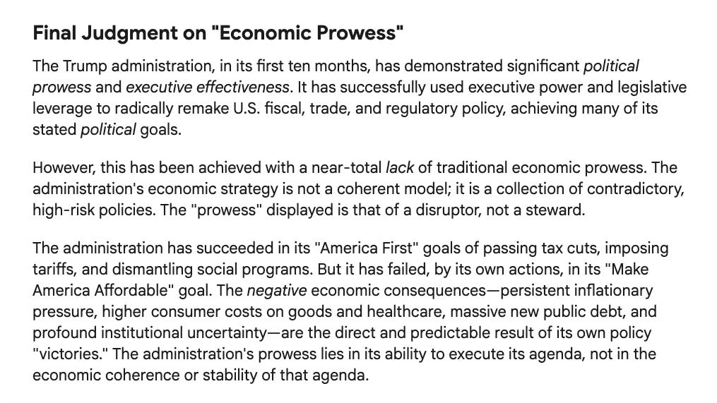 Gemini: The administration has succeeded in its “America First” goals of passing tax cuts, imposing tariffs, and dismantling social programs. But it has failed, by its own actions, in...