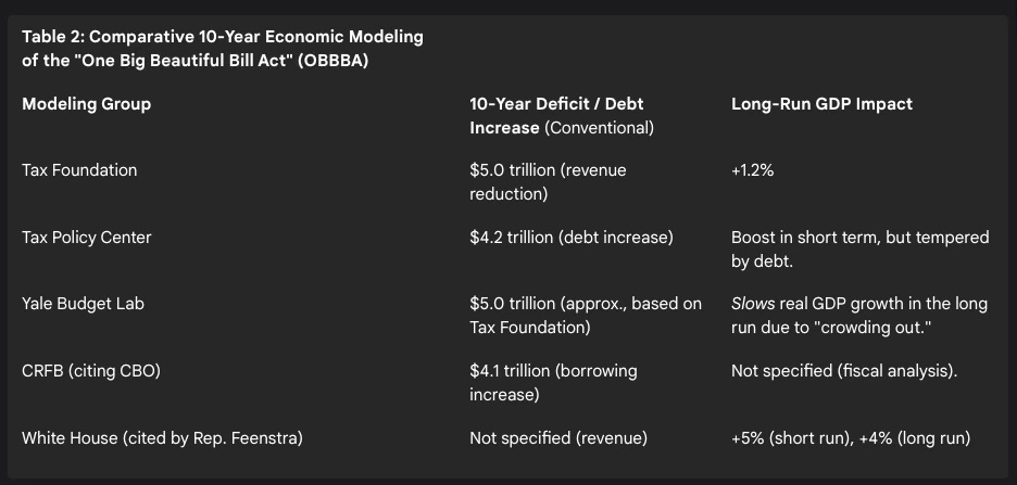 Supporters of the bill project significant macroeconomic benefits. The Tax Foundation’s General Equilibrium Model estimates the OBBBA will increase long-run GDP by 1.2%.47 Pro-administration sources, such as Rep. Randy Feenstra, cite White House Council of Economic Advisers estimates of a short-run GDP boost of over 5% and the creation of 4 million jobs in the long run.58 More moderate analyses, such as from Ameriprise Financial, concur that the law “should offer a modest boost to growth” in the intermediate term, particularly in 2026.56