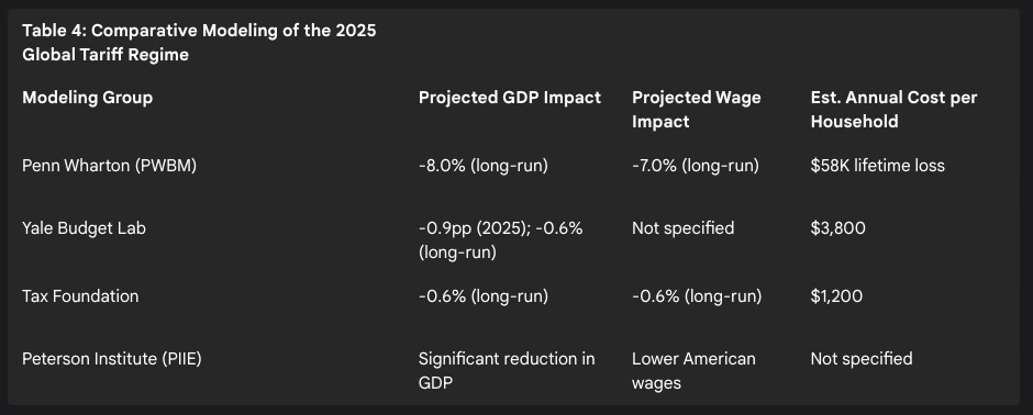 Penn Wharton Budget Model (PWBM): This model projects the most severe outcome, estimating the tariffs would reduce GDP by 8% and wages by 7% over the long term. This represents a $58,000 lifetime loss for a middle-income household and is twice as large a negative impact as a revenue-equivalent corporate tax increase.80