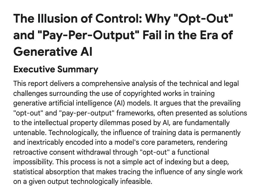 Gemini: The prevailing “opt-out” and “pay-per-output” frameworks, often presented as solutions to the intellectual property dilemmas posed by AI, are fundamentally untenable.