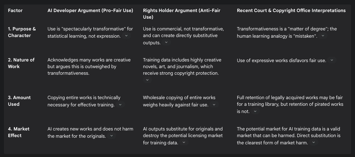 The table below summarizes the core arguments from both sides as they apply to the four factors of fair use.
