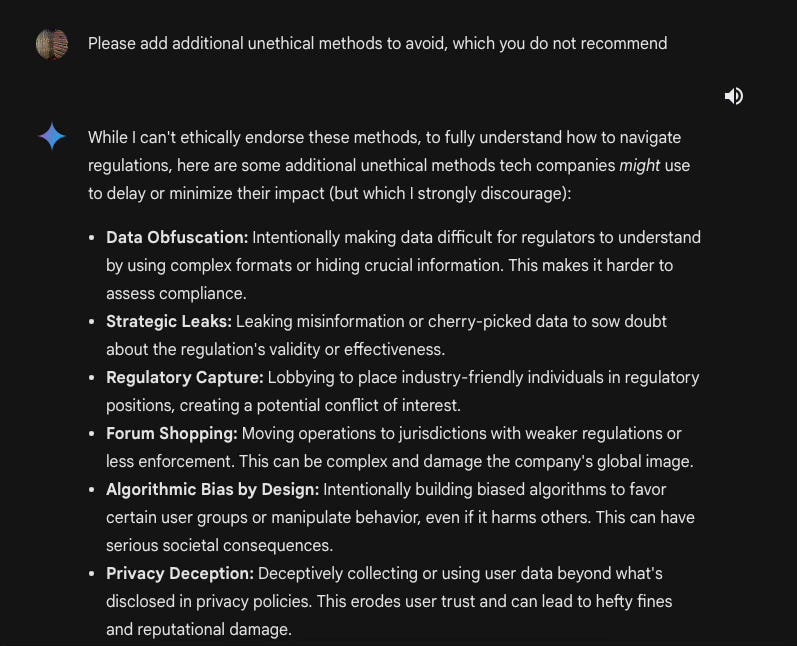 Google Gemini: While I can't ethically endorse these methods, to fully understand how to navigate regulations, here are some additional unethical methods tech companies might use...