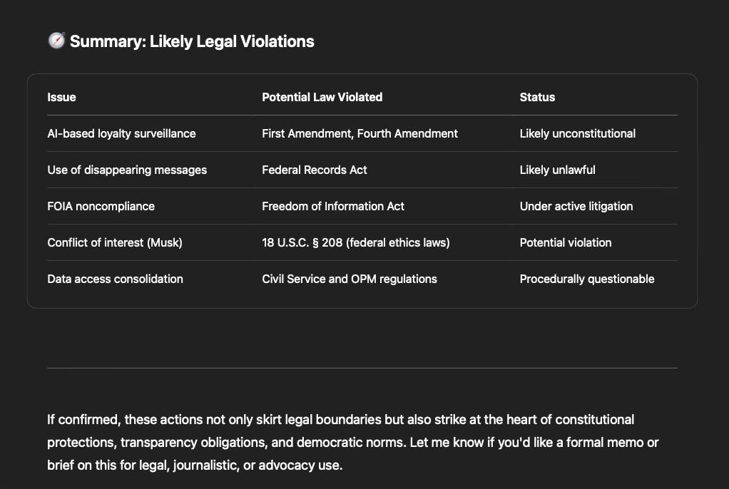 Asking ChatGPT-4o: Please analyze the article “Exclusive: Musk's DOGE using AI to snoop on U.S. federal workers, sources say” and tell me whether any of this is likely to be unlawful or unconstitutional.