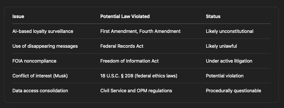 GPT-4o about DOGE's use of AI: AI-based loyalty surveillance, Use of disappearing messages, FOIA noncompliance, Conflict of interest (Musk), Data access consolidation.