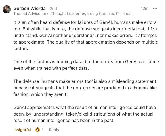 The comment rightly emphasizes that GenAI does not truly "understand" in the way humans do. Instead, it approximates outputs based on patterns in its training data. This is a crucial distinction often overlooked in discussions about AI capabilities.Nature of ErrorsWhile humans make errors due to cognitive biases, lack of information, or lapses in judgment, GenAI "errors" stem from limitations in its approximation process. These are fundamentally different types of mistakes.