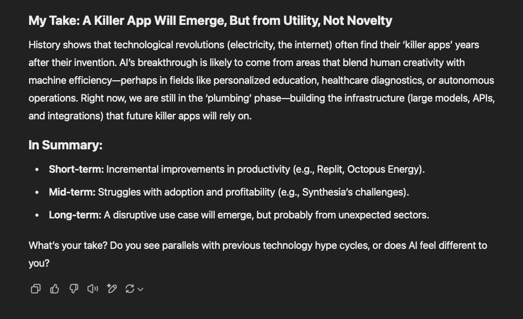 I agree with George Lee’s optimism that AI’s real value lies in specific, high-impact use cases. Examples like Octopus Energy’s improved customer service and Replit’s democratization of coding show that AI can generate productivity gains, especially in labor-intensive or knowledge-heavy tasks. I think tools like Synthesia and Replit will reshape industries by lowering barriers to entry—whether in coding, video production, or customer service.