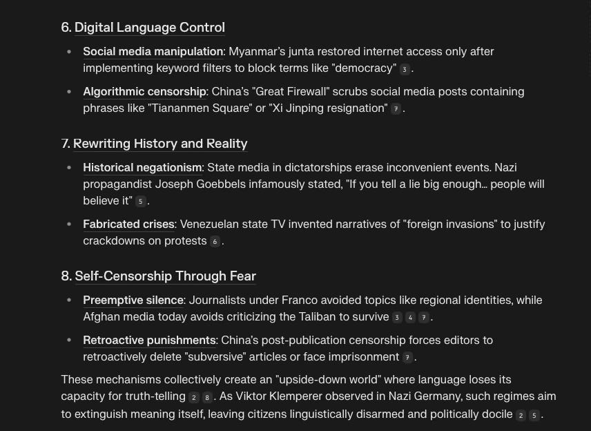 GPT-4o: Language shifts in dictatorships reflect the regime’s control over thought & expression. Gemini: Terms like "enemy of the state" & "traitor" are used. Dictatorships use language to dehumanize.