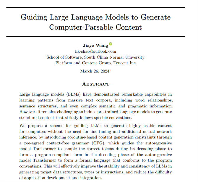 The paper "Guiding Large Language Models to Generate Computer-Parsable Content" by Jiaye Wang and others discusses techniques to improve the ability of large language models (LLMs) to generate structured content that can be easily processed by computers. Here's a simplified explanation of the key points:
