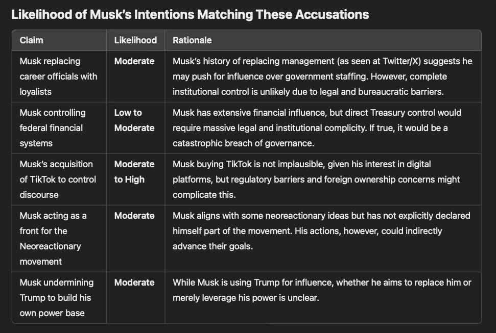 There are elements of truth in these accusations, particularly regarding Musk’s ambition to influence governance, financial systems, and public discourse. However, the most extreme claims—such as Musk effectively running the U.S. government or executing a neoreactionary coup—remain speculative and face significant legal and institutional roadblocks.