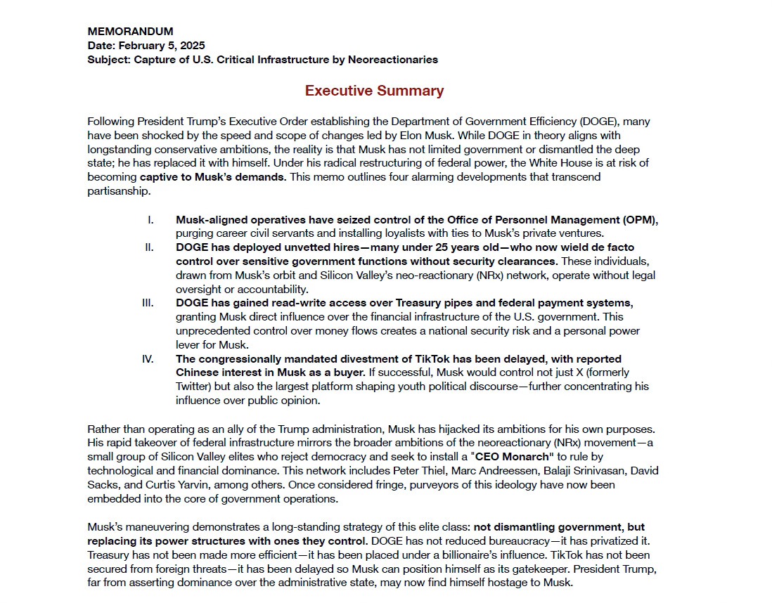 The allegations were published in a memo by Dave Troy, an American technologist and investigative journalist, who warns about the danger of Elon Musk’s unchecked power and the need for greater transparency and accountability in government. The memo calls for immediate congressional action to "reassert democratic control and prevent Musk's further entrenchment into government infrastructure."