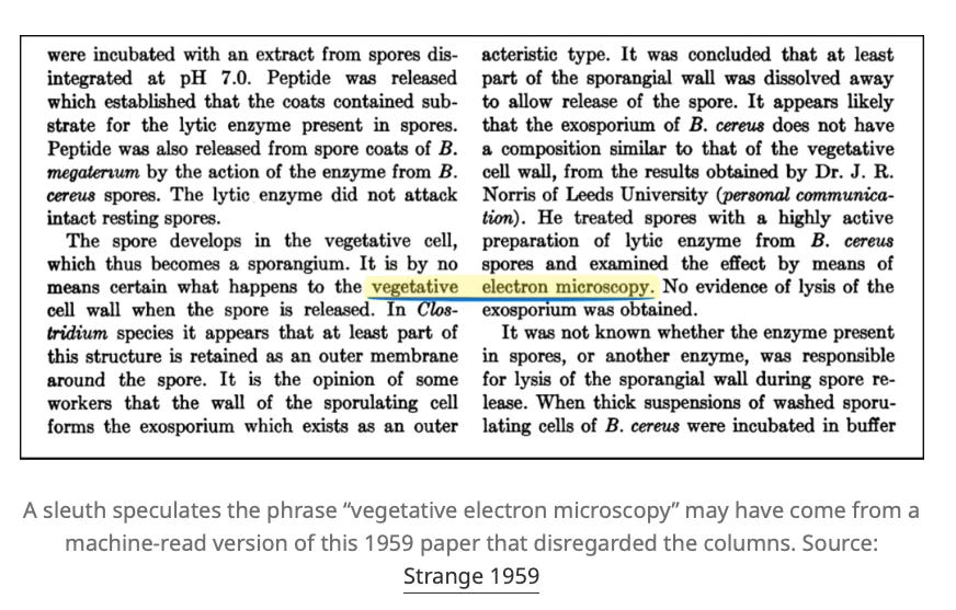 AI-Generated Errors in Abstracts and Methods Sections: Similar to the vegetative electron microscopy case, generative AI models have produced erroneous terminology by combining words from adjacent columns in scanned PDFs.
