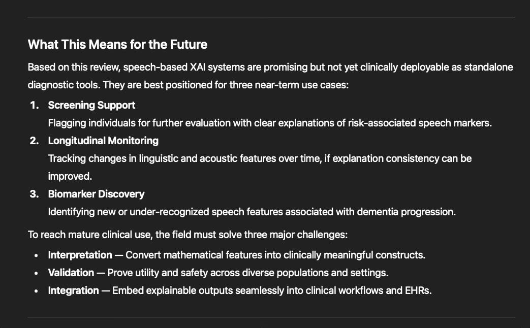 This systematic review provides the clearest evidence to date that explainable AI can illuminate speech-based biomarkers of cognitive decline with significant clinical potential. But the field has not yet matured to the point of deployment. The gap is not technical—it is human. Without clinician engagement, workflow integration, standardized evaluation, and real-world validation, even the most sophisticated XAI method remains a research artefact rather than a medical tool.