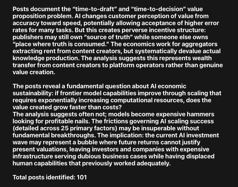 Posts document the “time-to-draft” and “time-to-decision” value proposition problem. AI changes customer perception of value from accuracy toward speed, potentially allowing acceptance of higher error rates for many tasks. But this creates perverse incentive structure: publishers may still own “source of truth” while someone else owns “place where truth is consumed.” The economics work for aggregators extracting rent from content creators, but systematically devalue actual knowledge production. The analysis suggests this represents wealth transfer from content creators to platform operators rather than genuine value creation.
