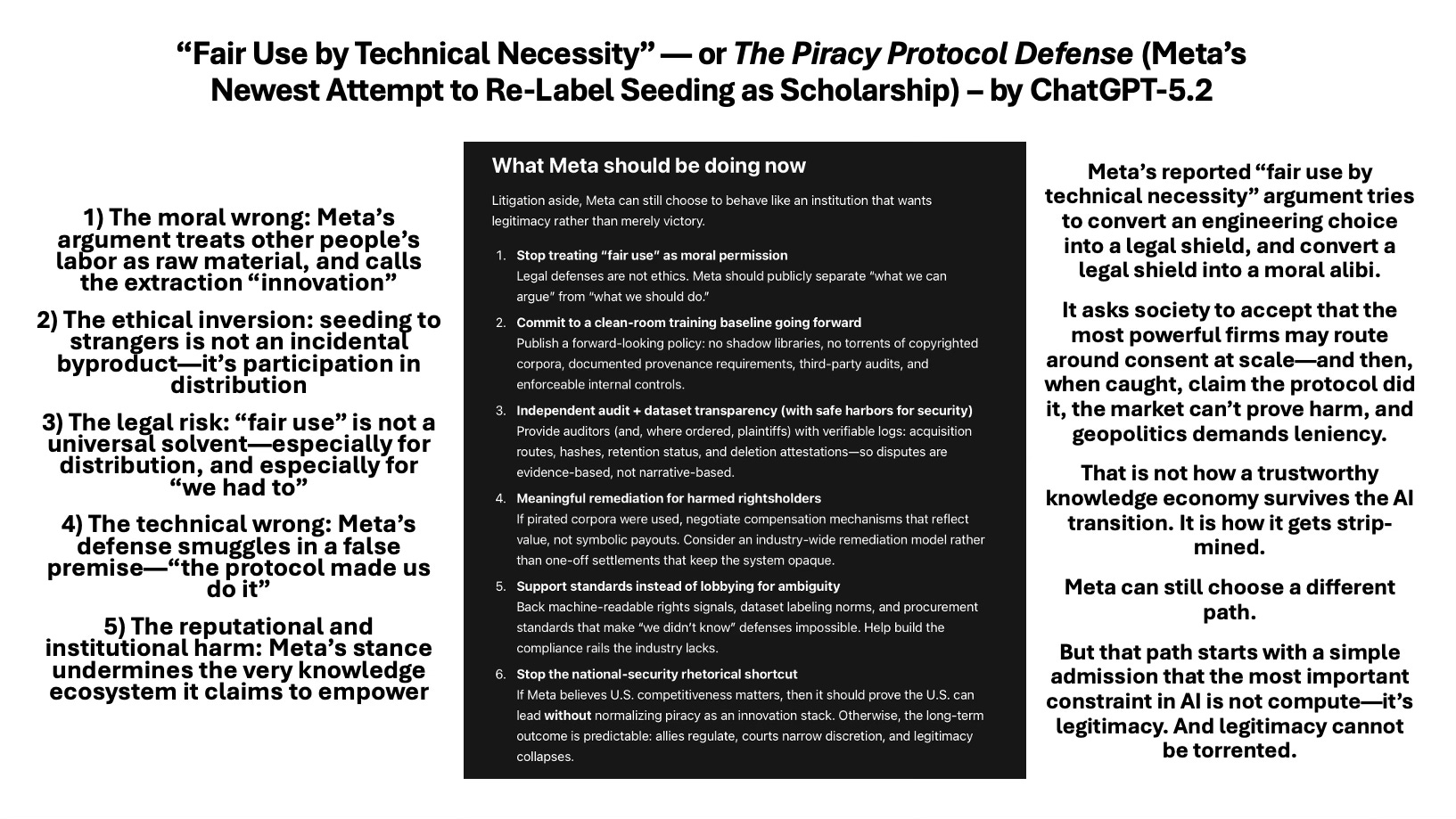 Even if Meta could win a narrow legal argument, the broader harm remains: this behavior signals that the written record is an extractive frontier rather than a rights-respecting commons.