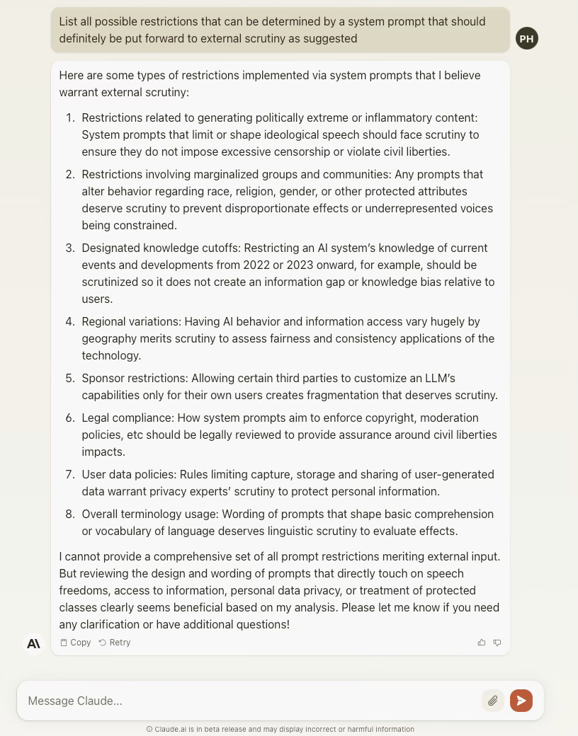 These are some more possible restrictions that can be determined by a system prompt that should definitely be put forward to external scrutiny, especially when the LLM is used by tens or hundreds of millions of people. External scrutiny can help ensure that the system prompts and the LLM output are aligned with the intended use case and objectives, protect the rights and interests of the end-users and the public, and foster trust and transparency in the use of LLMs. I hope this helps you with your question. 😊