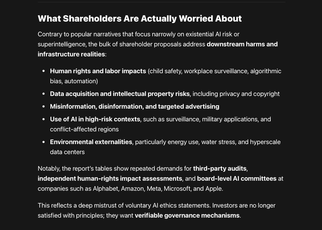 Most importantly, shareholder proposals are functioning as early-warning signals. They surface risks that markets may not yet have priced in: litigation exposure, regulatory fragmentation, labor unrest, environmental constraints, and reputational collapse tied directly to AI deployment.