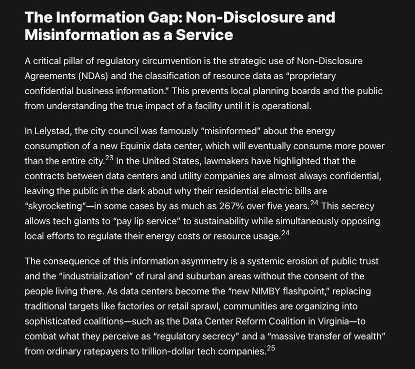 In Lelystad, the city council was famously “misinformed” about the energy consumption of a new Equinix data center, which will eventually consume more power than the entire city.23 In the United States, lawmakers have highlighted that the contracts between data centers and utility companies are almost always confidential, leaving the public in the dark about why their residential electric bills are “skyrocketing”—in some cases by as much as 267% over five years.24 This secrecy allows tech giants to “pay lip service” to sustainability while simultaneously opposing local efforts to regulate their energy costs or resource usage.24