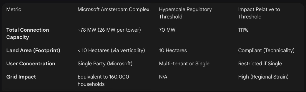 In the Netherlands, this method has been utilized with surgical precision. Following a 2022 national interim ban on the permitting of new hyperscale data centers—defined as facilities or integrated groups of buildings covering more than 10 hectares with an electrical connection capacity of at least 70 MW—the industry sought alternative routes to expansion.1 A notable instance involves a project in Amsterdam’s Western Port Area consisting of three 85-meter-high towers.2 While the combined complex functions as a singular infrastructure node for a single user (Microsoft), the project was divided into three separate permits.2 Because each tower individually falls below the 10-hectare threshold and is treated as a “small” data center by provincial authorities, the project circumvented the national ban.1