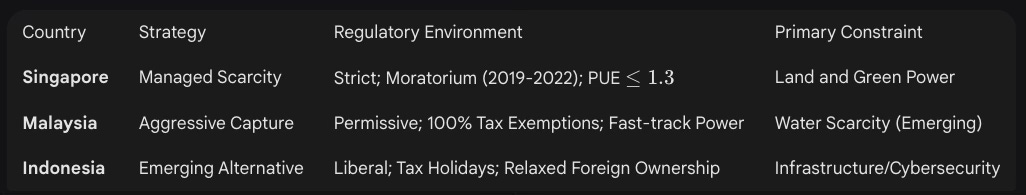 When regulatory environments become too restrictive in established hubs, data center capital does not vanish; it migrates to neighboring regions with lower thresholds, a process known as jurisdictional arbitrage. This is most visible in the “digital triangle” of Singapore, Malaysia, and Indonesia.